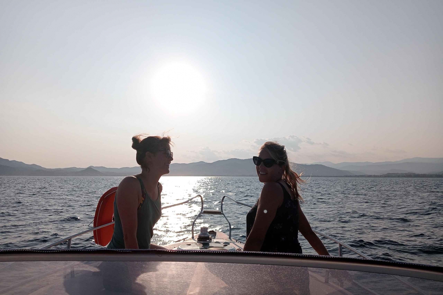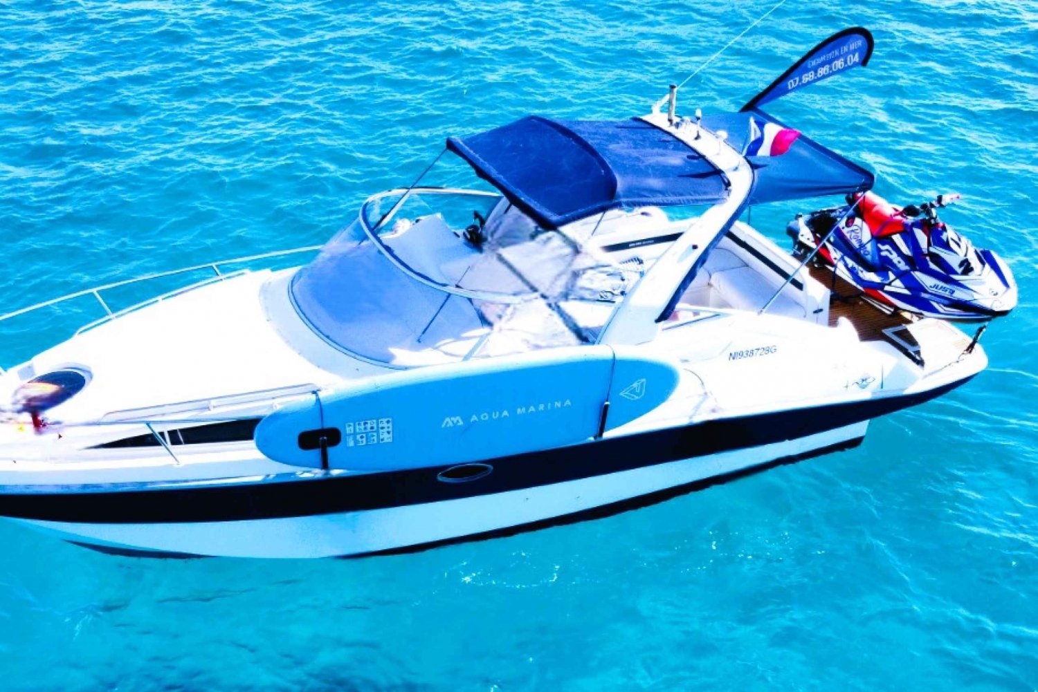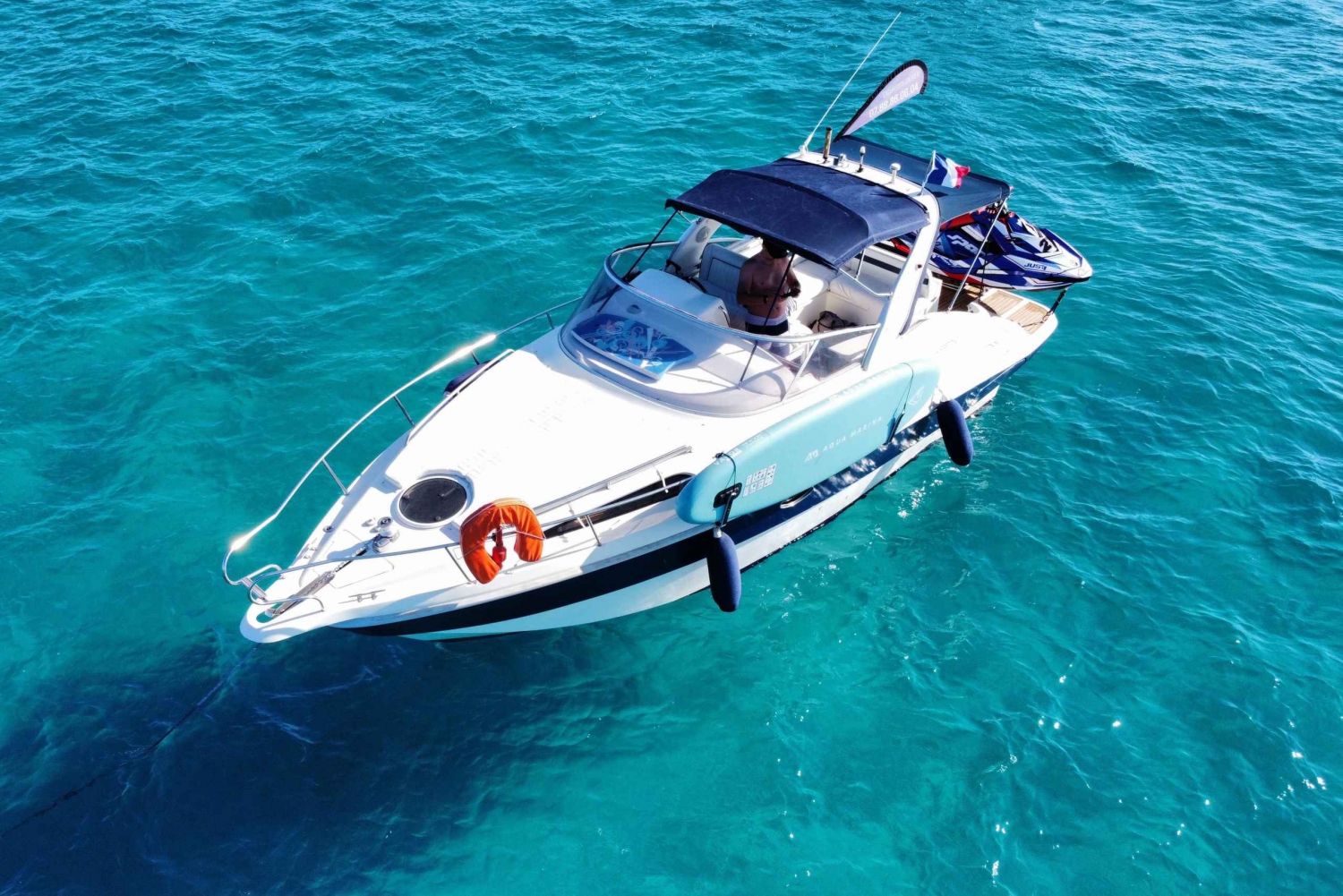Das komfortable und perfekt für bis zu 7 Passagiere ausgelegte Boot Motors Expérience erwartet dich zu einer großartigen Kreuzfahrt von Mandelieu-la-Napoule aus in Richtung Théoule-sur-Mer und seinen wilden Buchten oder zu den unübersehbaren Lérins-Inseln gegenüber von Cannes. Du wirst das Vergnügen haben, besondere Momente in der Gesellschaft deiner Liebsten zu verbringen, mit einem professionellen Skipper am Steuer, der dich zu den schönsten Orten an der Küste des Golfs von Napoule bringt. An Bord profitierst du von allem Komfort, den du für eine außergewöhnliche Kreuzfahrt brauchst: eine Liegewiese im vorderen Teil des Bootes, ein sicherer Salon im hinteren Teil mit Tisch und Bänken, eine Dusche und Toilette im Inneren. Gegen eine zusätzliche Gebühr kannst du auch eine Schnorchelausrüstung (Maske, Flossen und Schnorchel), einen Jetski, einen Unterwasserscooter und ein Paddel bekommen, um in den gemäßigten Gewässern des Mittelmeers Spaß zu haben. Zwischen Entspannung und Schwimmen wird dir diese private Bootstour ab Mandelieu-la-Napoule unvergessliche Momente bieten! Sobald du an Bord des Bootes bist, bringt dich der Skipper zum Golf von Napoule, indem er die Siagne für 20 Minuten überquert. Danach hast du dank der angenehmen Reisegeschwindigkeit von 7 Knoten viel Zeit, die umliegenden Landschaften zu genießen: Théoule-sur-Mer und seine Buchten, die Lérins-Inseln, aber auch Cannes und seine Croisette. Egal, ob du ein Paar, eine Familie oder Freunde bist, du kannst dir sicher sein, dass das Mieten eines Bootes mit einem Skipper in Mandelieu-la-Napoule dir tolle Erinnerungen an der Côte d'Azur bescheren wird!Includes