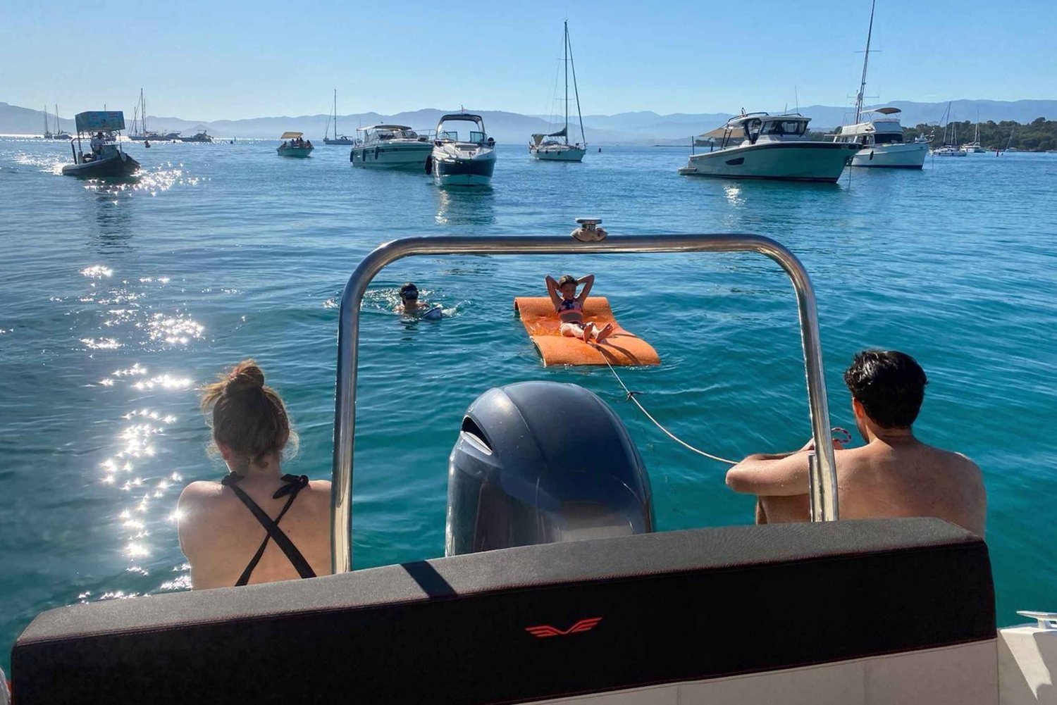 Vivi un'esperienza unica a Cannes durante una crociera privata al tramonto tra le isole di Lérins, accompagnato da uno skipper locale esperto e appassionato. A bordo della tua barca di 6,80 m, accomodati sul grande lettino o siediti comodamente sul retro, rilassati e goditi la traversata con una vista panoramica sulla baia. All'ormeggio tra Sainte-Marguerite e Saint-Honorat, tuffati nelle acque turchesi con maschera e boccaglio, prova lo scooter subacqueo incluso o lasciati trasportare sul materassino galleggiante per un momento di puro relax. Per completare questa esperienza, ti offriamo una bottiglia di rosé, da gustare mentre ammiri il tramonto e crei ricordi indimenticabili. Puoi anche goderti l'atmosfera intorno alle barche-bar e alle food boat, rimanendo comodamente seduto sulla tua barca. La crociera si conclude con un tranquillo ritorno a Cannes, con i colori dorati del sole che si riflettono sul mare e una sensazione di relax e serenità indimenticabile.Includes