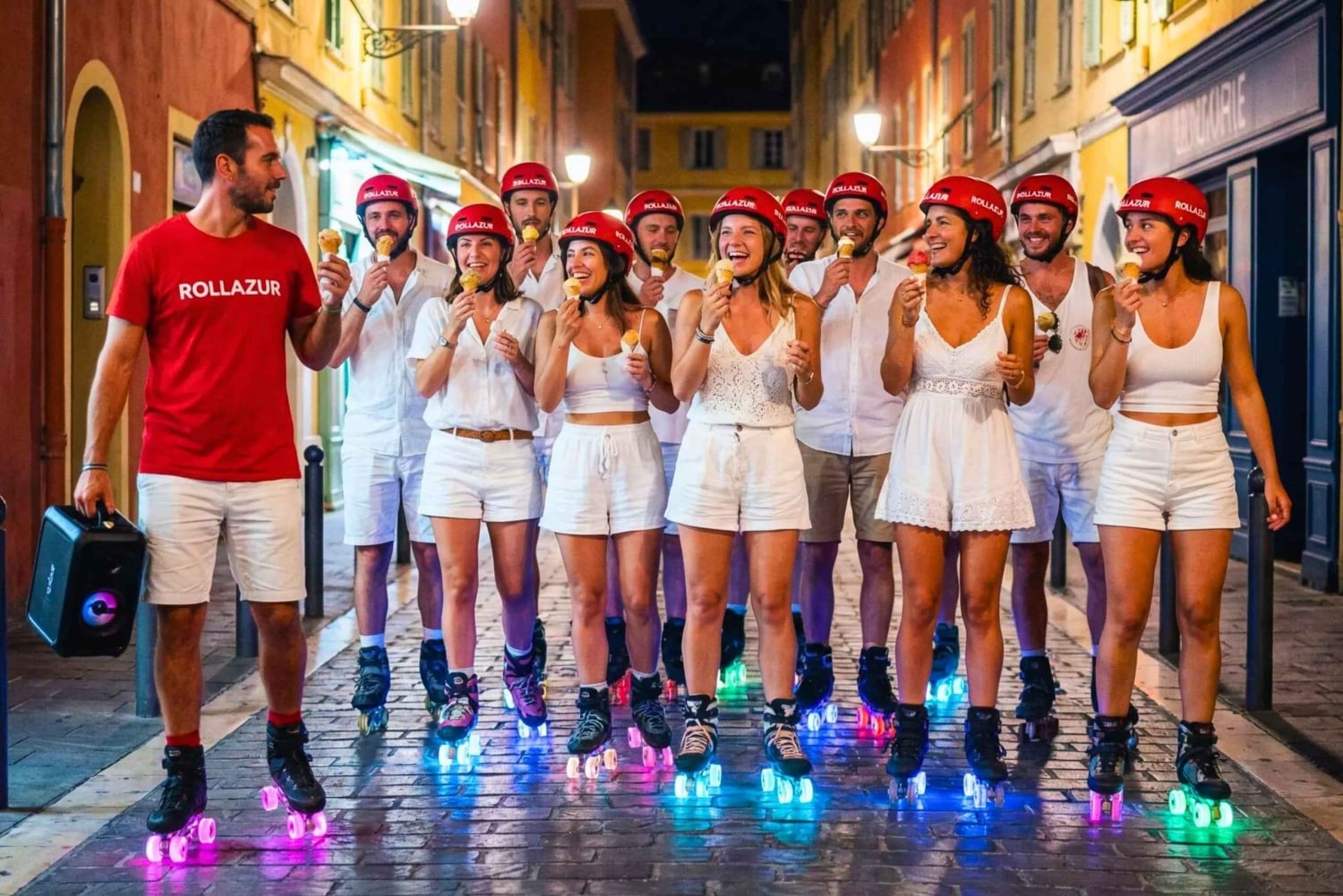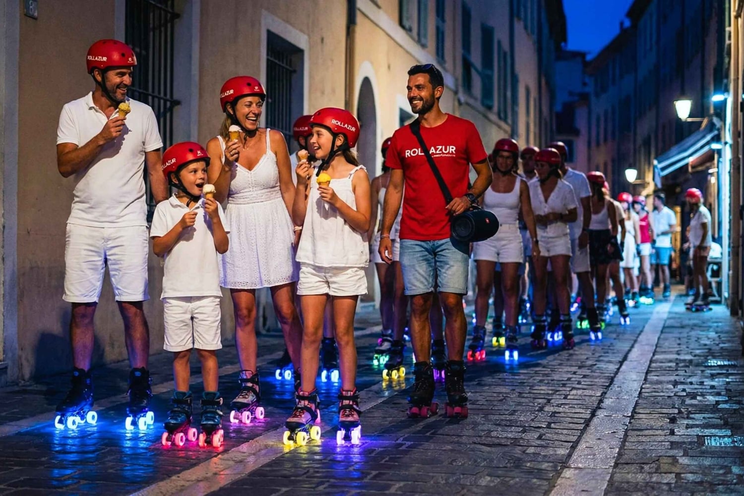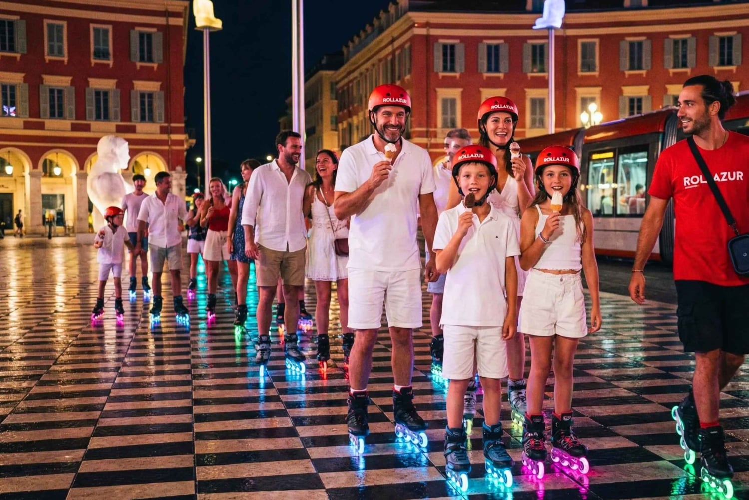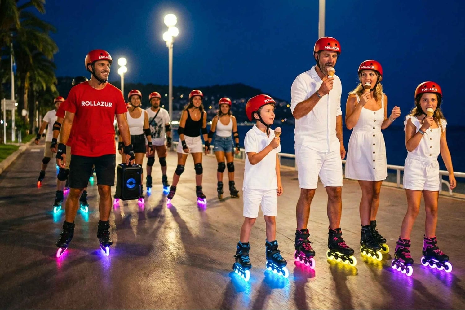 Vuoi vivere un'esperienza unica, in vacanza con i tuoi amici o la tua famiglia? Indossa i nostri pattini a rotelle che si illuminano di notte e partecipa ai nostri tour notturni appositamente progettati per tutti gli amanti dello skateboard. Vieni a divertirti a scoprire e illuminare le strade di Nizza sotto le stelle in modo sicuro e musicale in un'atmosfera retrò!