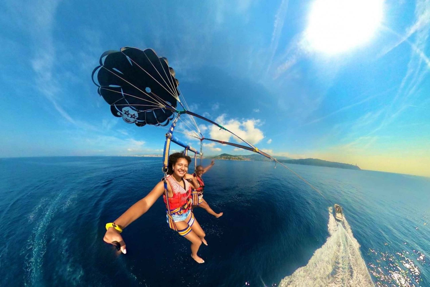 ニースのLympia港から快適なモーターボートに乗り込み、海岸の息を呑むような景色を眺めながら水上に舞い上がりましょう。パラセーリングは2名または3名でご利用ください。 体重160kg以下の2人または3人用フライト - 個人でのフライトは禁止されています - 時間枠の15分前までに到着してください - 時間枠の15分前までに到着してください - 時間枠の15分前までに到着してください。 1998年以来ウォータースポーツインストラクターの資格を持つインストラクターの指導のもと、高品質のパラセーリング用具を装備します。最高100メートルの高さを飛ぶスリルを味わってください。 静寂に包まれながら、美しいビーチや透き通った海を眺めることができます。この高さに約12分間滞在した後、濡れることなくスムーズにボートに着水します。 パラセーリングの最後には、忘れられない思い出とともに集合場所に戻りましょう。 パラセーリングの所要時間は、予約状況により1時間になることもあります。 チケットは予約枠でのみ有効です。予約時間に遅れた場合、チケットの払い戻しや予約の変更はできません。 他のお客様へのご配慮のため、出発時刻の15分前にはお越しください。 飛行機をご利用の方のみご乗船いただけます。 同伴者の乗船はできません。 屋外でのアクティビティは天候に左右されます。その場合、再集合となります。Includes