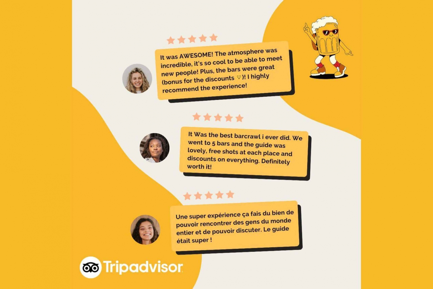 Приготовьтесь к самой безумной ночи в Ницце, где каждый бар станет незабываемым воспоминанием. Добро пожаловать в Beer&Dash, лучший паб-кроул / бар-кроул на Французской Ривьере. 5 баров, 5 настоящих шотов, настоящий VIP-клуб, веселые игры и более 50 путешественников со всего мира — это не просто ночь, это социальное приключение. Независимо от того, путешествуете ли вы в одиночку, с партнером или с друзьями, вы мгновенно найдете общий язык с другими гостями под руководством наших местных профессионалов (1 гид на 15 участников). ⚠️ Билеты на пятницу и субботу раскупаются быстро, до 120 гостей могут принять участие в вечеринке! ⸻ Вот что вас ждет: ✔️ 4 тщательно отобранных бара — не просто «то, что есть», а настоящая атмосфера ✔️ 5 настоящих шотов включены в стоимость — по одному в каждом заведении, плюс последний перед клубом ✔️ Бесплатный VIP-вход в настоящий ночной клуб Ниццы — не шумный паб со стробоскопами ✔️ Фотограф и талисман, которые запечатлеют ваши самые яркие моменты ✔️ Алкогольные игры, знакомства, хорошая атмосфера ✔️ Специальные предложения на напитки — коктейли и пиво от 6 евро ✔️ Безопасность, веселье, полное сопровождение — настоящими местными жителями (а не случайными туристами) ✔️ Ваш билет действителен только на одну ночь, но если вы захотите присоединиться снова, вы получите 50% скидку на следующий паб-кроул! Просто покажите свой предыдущий браслет (не обрезанный) в качестве подтверждения. ⸻ ✅ Почему Beer&Dash? Потому что мы знаем город, мы знаем людей и с 2018 года организуем лучшие ночные развлечения в Ницце и Каннах. От коктейльных мастер-классов до квест-игр на открытом воздухе — все, что мы делаем, построено на веселье, общении и аутентичности. Тысячи путешественников, студентов и местных жителей каждый сезон доверяют нам, чтобы испытать настоящую ночную жизнь, а не дешевую версию для TikTok. бар-кроул в Ницце — паб-кроул в Ницце — бар-кроул во Франции — паб-кроул на Французской РивьереIncludes